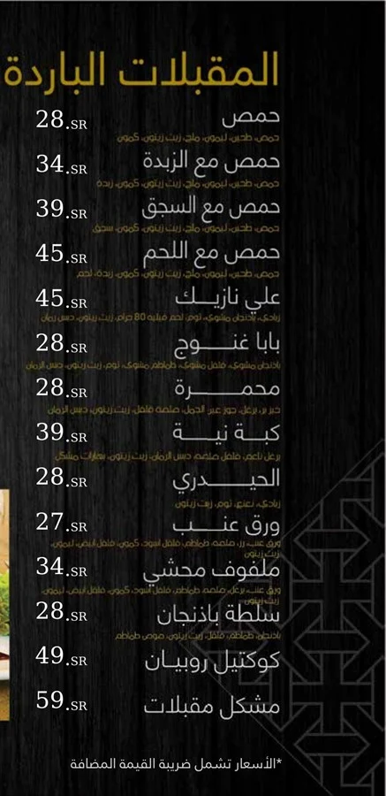 كانت تجربة جداً جداً جميلة مطعم راقي واكل جميل جداً ..! وتعامل الأخ حـقـي جداً ممتاز و متعاون فقد كان دمثاً في اخلاقه و تعامله فله مني كل الشكر و الامتنان طلبت شي لم اجده في التعليقات من المقبلات اعجبني كثيراً سلطة الباذنجان بصراحة اعجبتني بشكل خورافي وفي المرة القادمة سأطلب صحنين منها علماً ان بها ثوووم حتى اكون اميناً معكم 😊